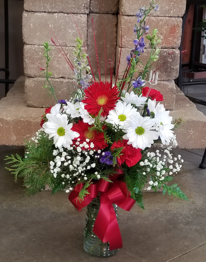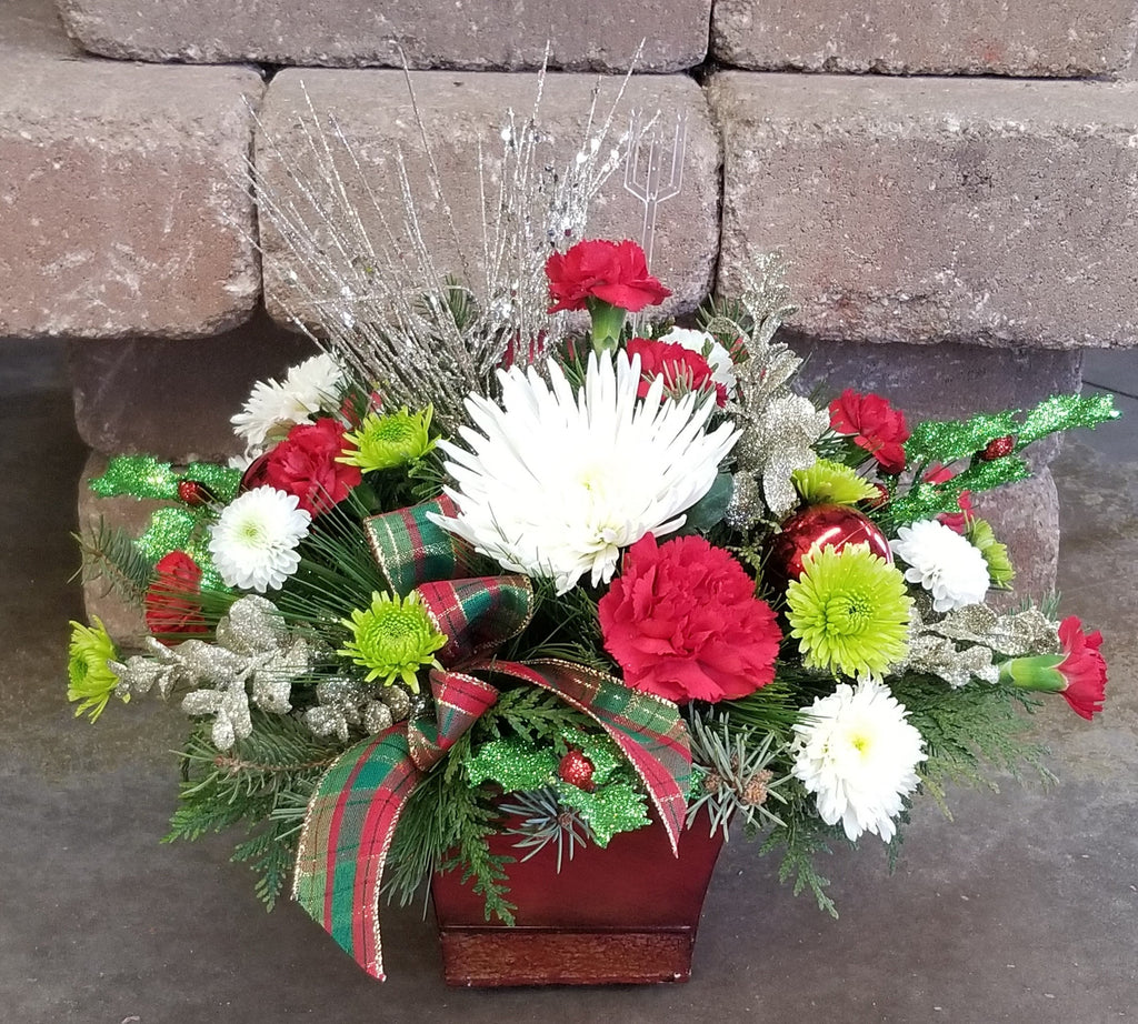 Please note: All holiday flower arrangement orders will be filled with seasonal flowers, evergreens, and greenery as available and include designer container or vase. Our floral bouquet designs are unique so each bouquet will be different. Call us at 563-539-2565 to order a custom arrangement.